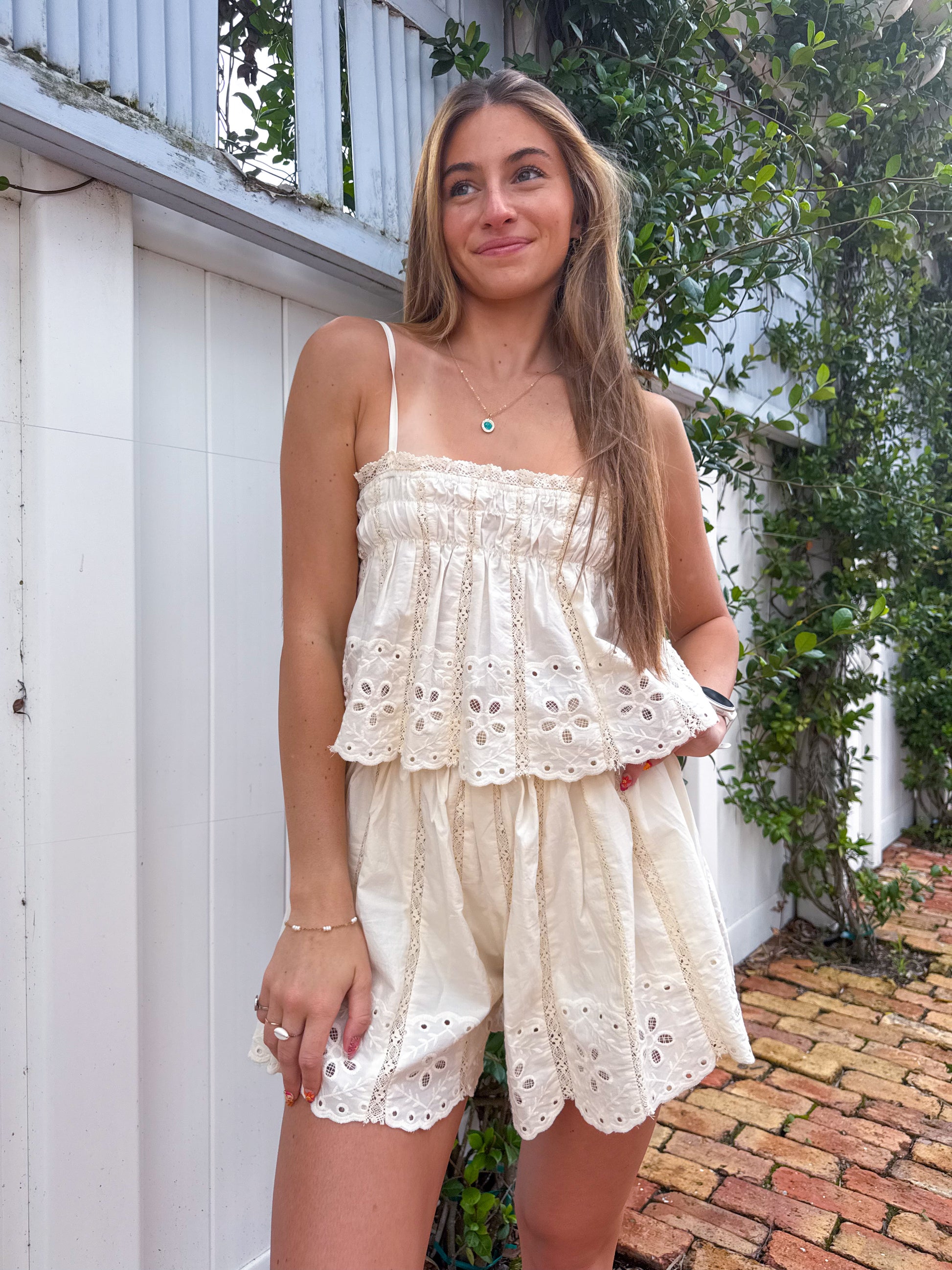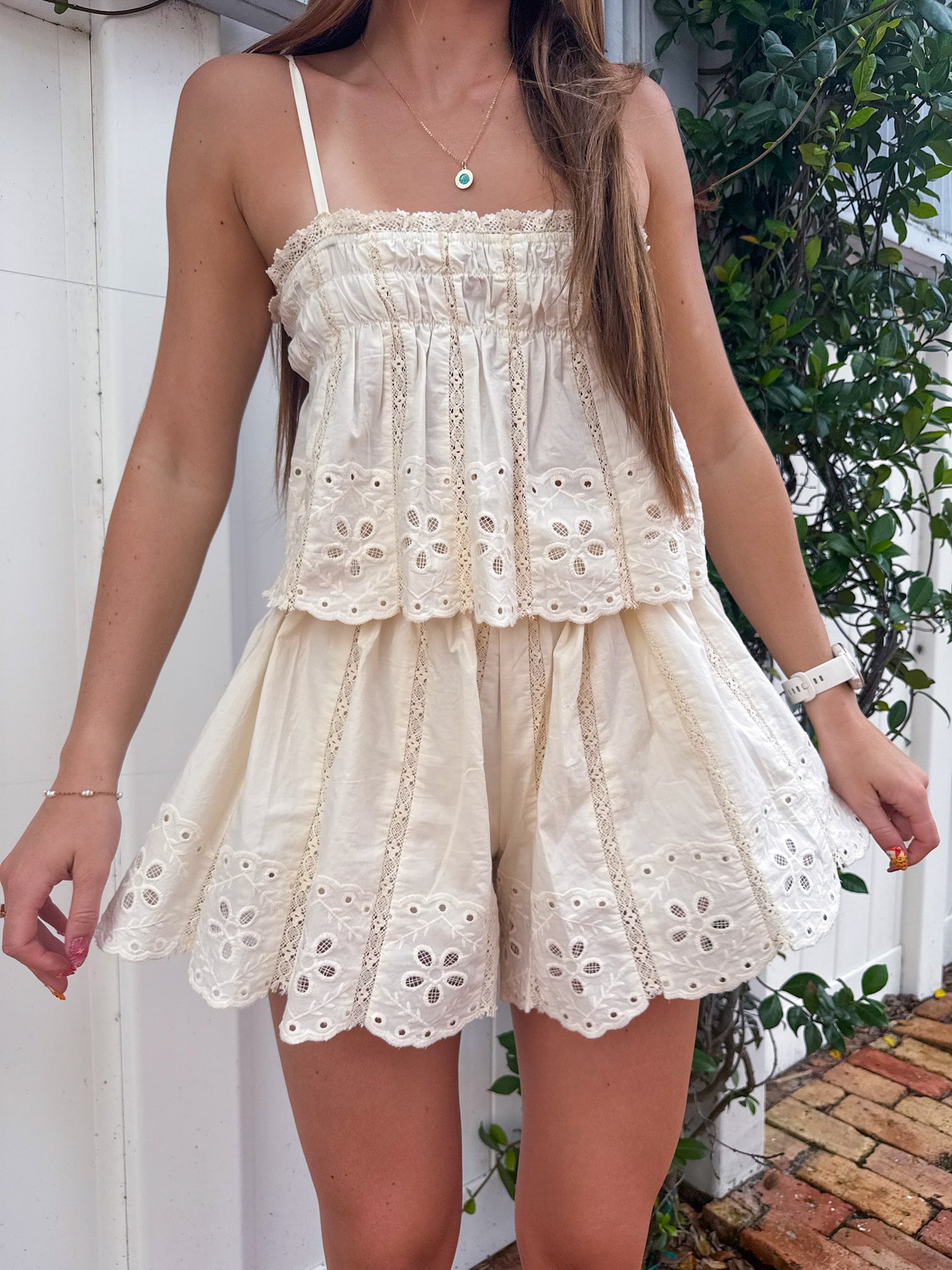 EMBROIDERED CAMI AND SHORTS SET WITH LACE TRIM -SMOCKING
